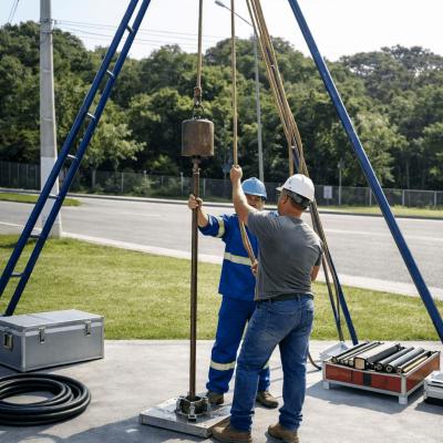 Perfuração manual de pequeno diâmetro, indicada para coleta de amostras e reconhecimento preliminar em profundidades menores.